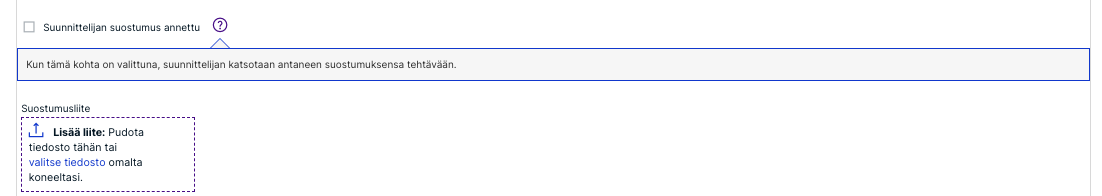 Huom! Suunnittelijoiden tiedoissa olevan suunnittelijan suostumuksen voi antaa vain suunnittelija itse. Kun kohta on valittuna, suunnittelijan katsotaan antaneen suostumuksensa tehtävään. Suostumusliite lisätään pudottamalla se katkoviivoilla merkityn alueen sisälle tai klikkaamalla "valitse tiedosto"-tekstiä.