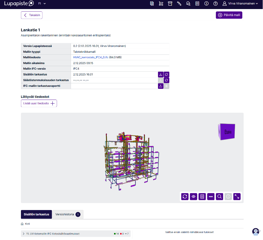 Tietomallivälilehden AVAA MALLI-toiminnolla avautuu tietomallinäkymä. Näkymällä esitetään malliin ja hankkeeseen liittyvät perustiedot, mallin 3D-näkymä sekä mallintarkastuksen tulokset.