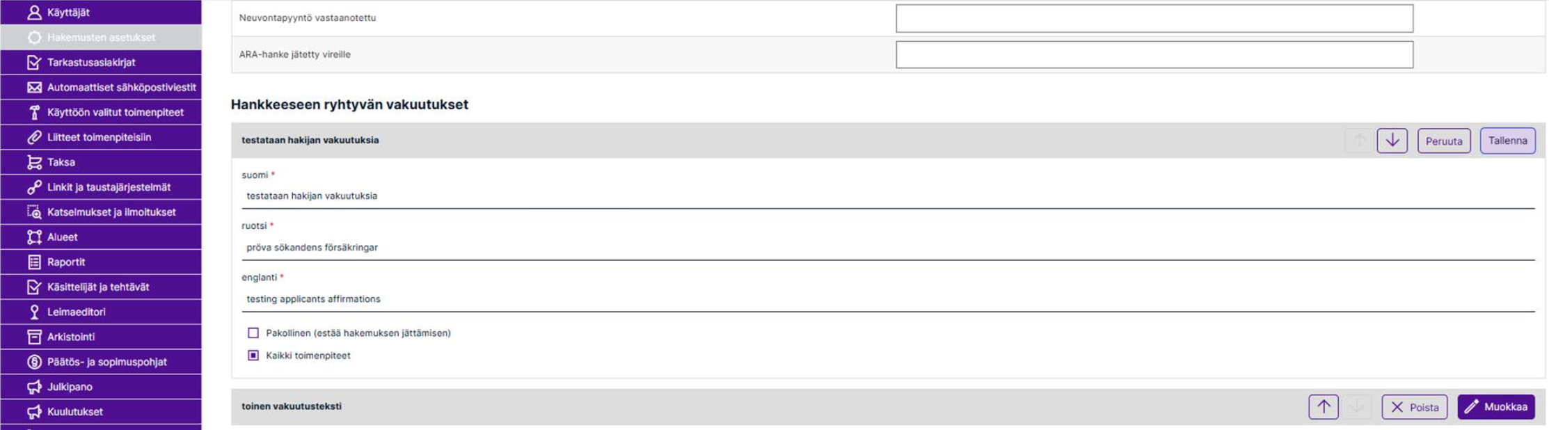 Pääkäyttäjä määrittää vakuutusten sisällöt pääkäyttäjäasetusten ”Hakemusten asetukset”-osiossa ja valitsee mille toimenpiteille mikäkin vakuutus näytetään, ja vaaditaanko se pakollisena ennen kuin hakemusta voi jättää.