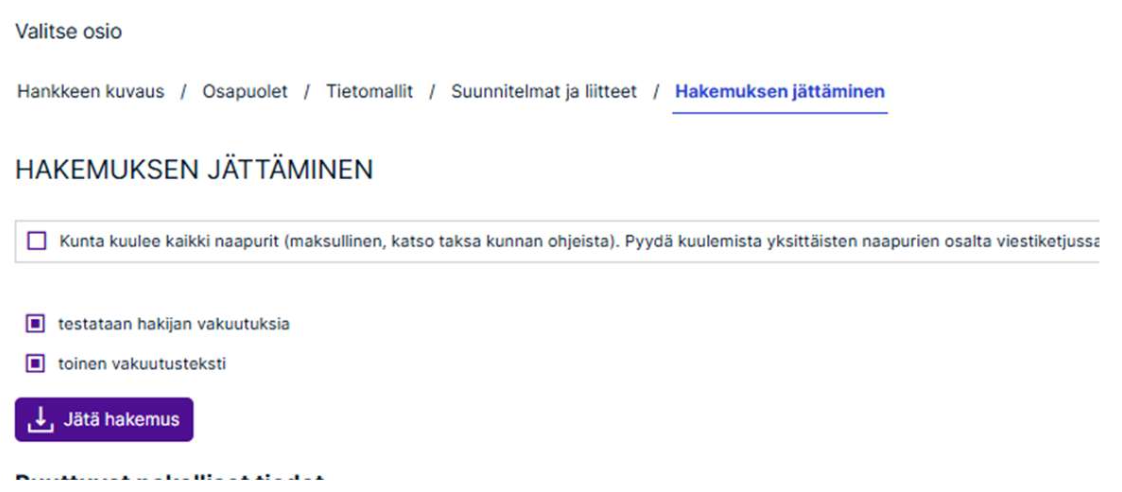 Ennen hakemuksen jättämistä hakija valitsee tarvittavat vakuutukset (ei voi jättää hakemusta, jos vakuutukset on asetettu pakollisiksi pääkäyttäjäasetuksissa).