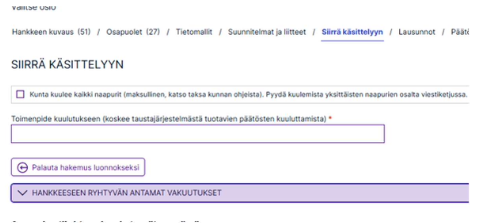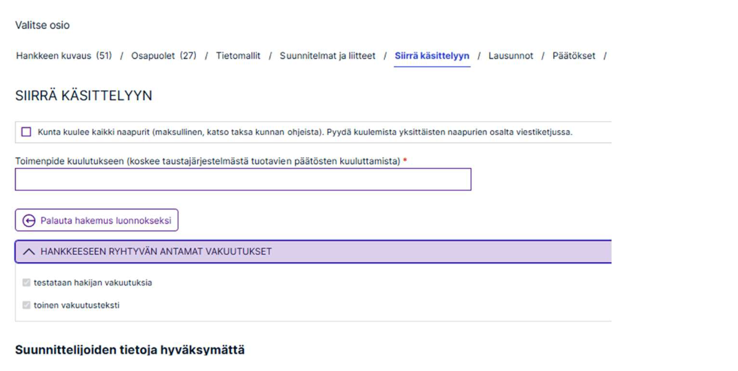 Viranomaiselle annetut vakuutukset näkyvät hakemusta käsiteltäessä ”Siirrä käsittelyyn”-osiossa.