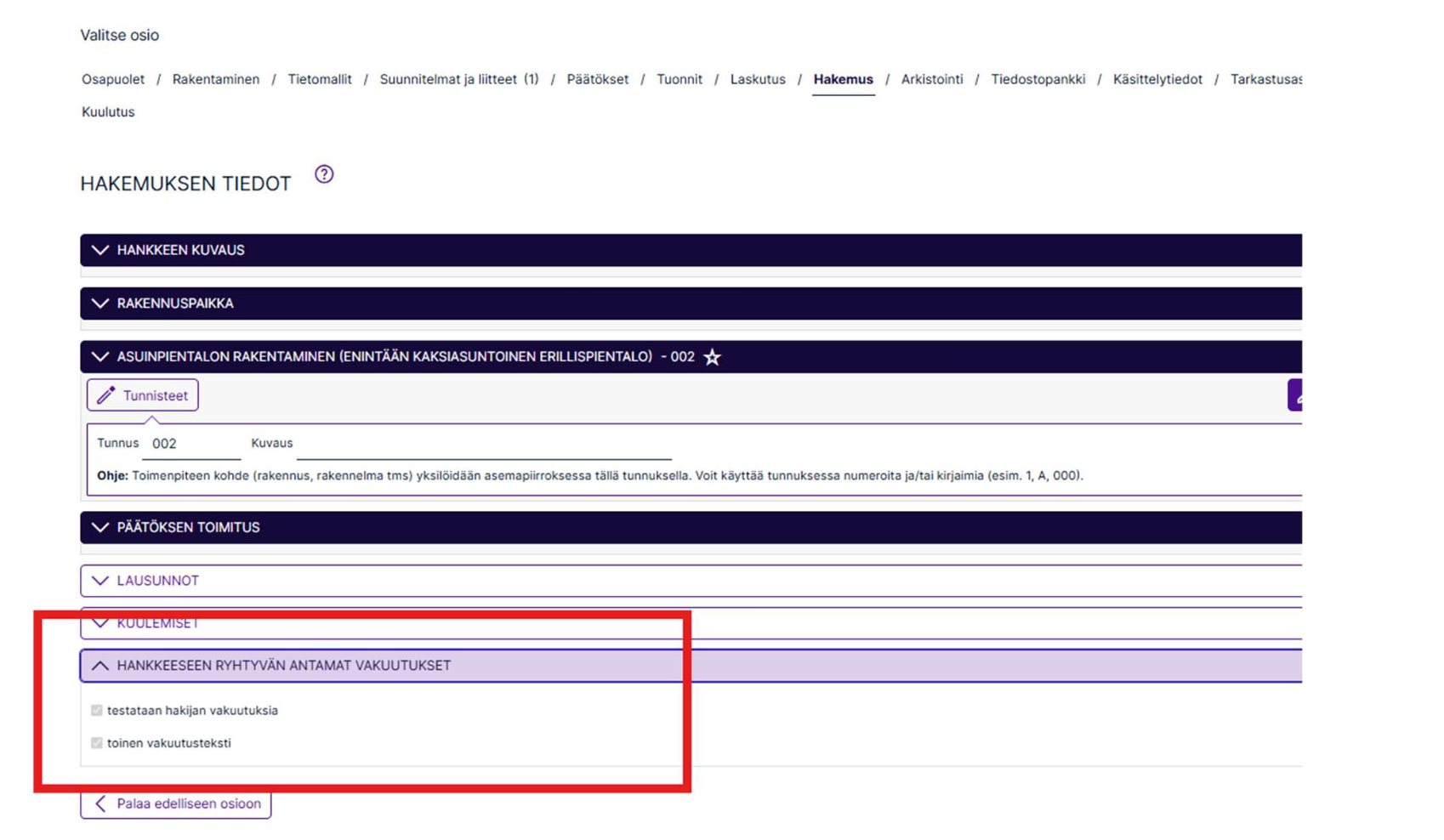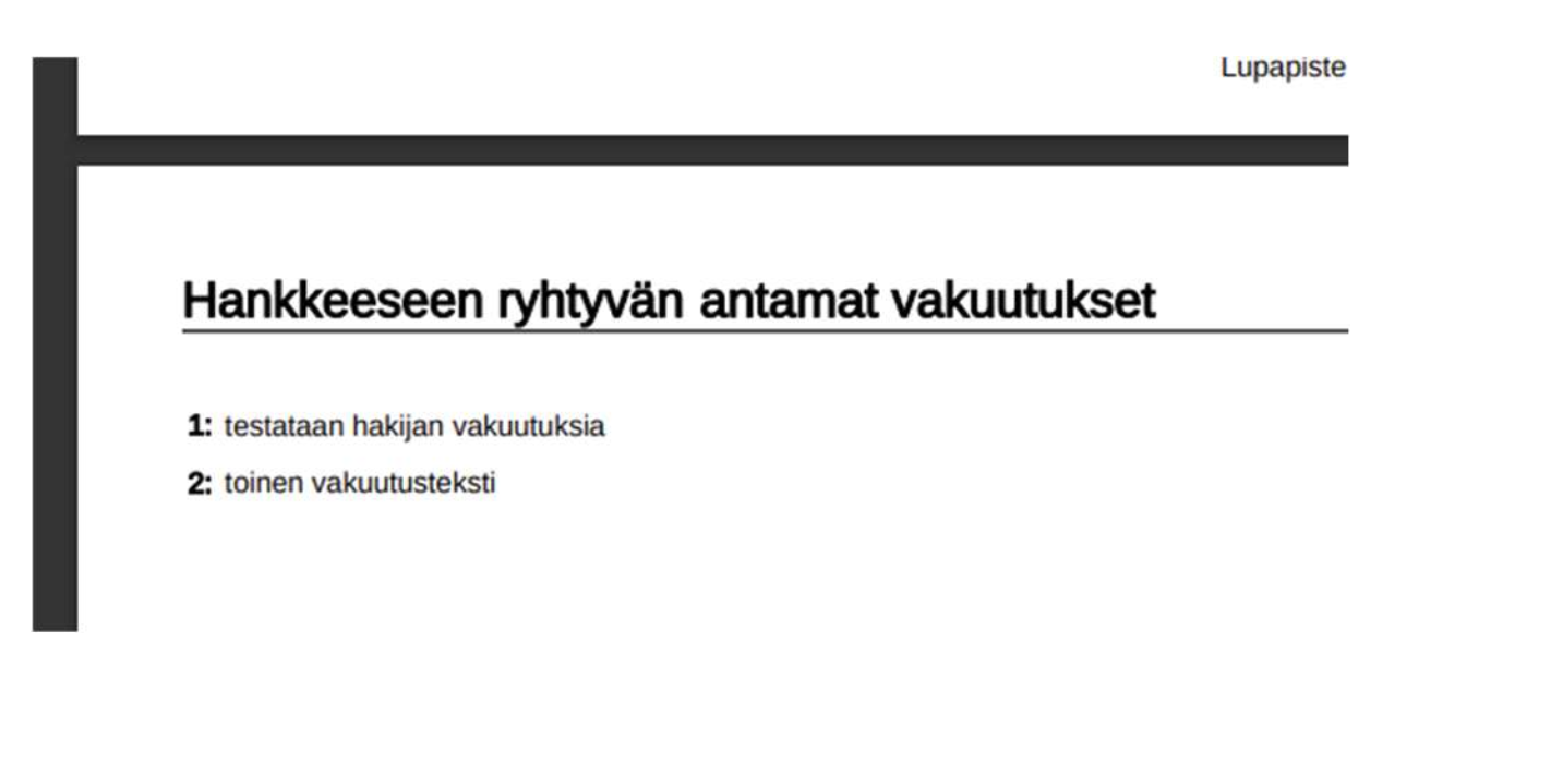 Kun ”Hankkeeseen ryhtyvän antamat vakuutukset” kohdan avaa, näkyvät annetut vakuutukset.