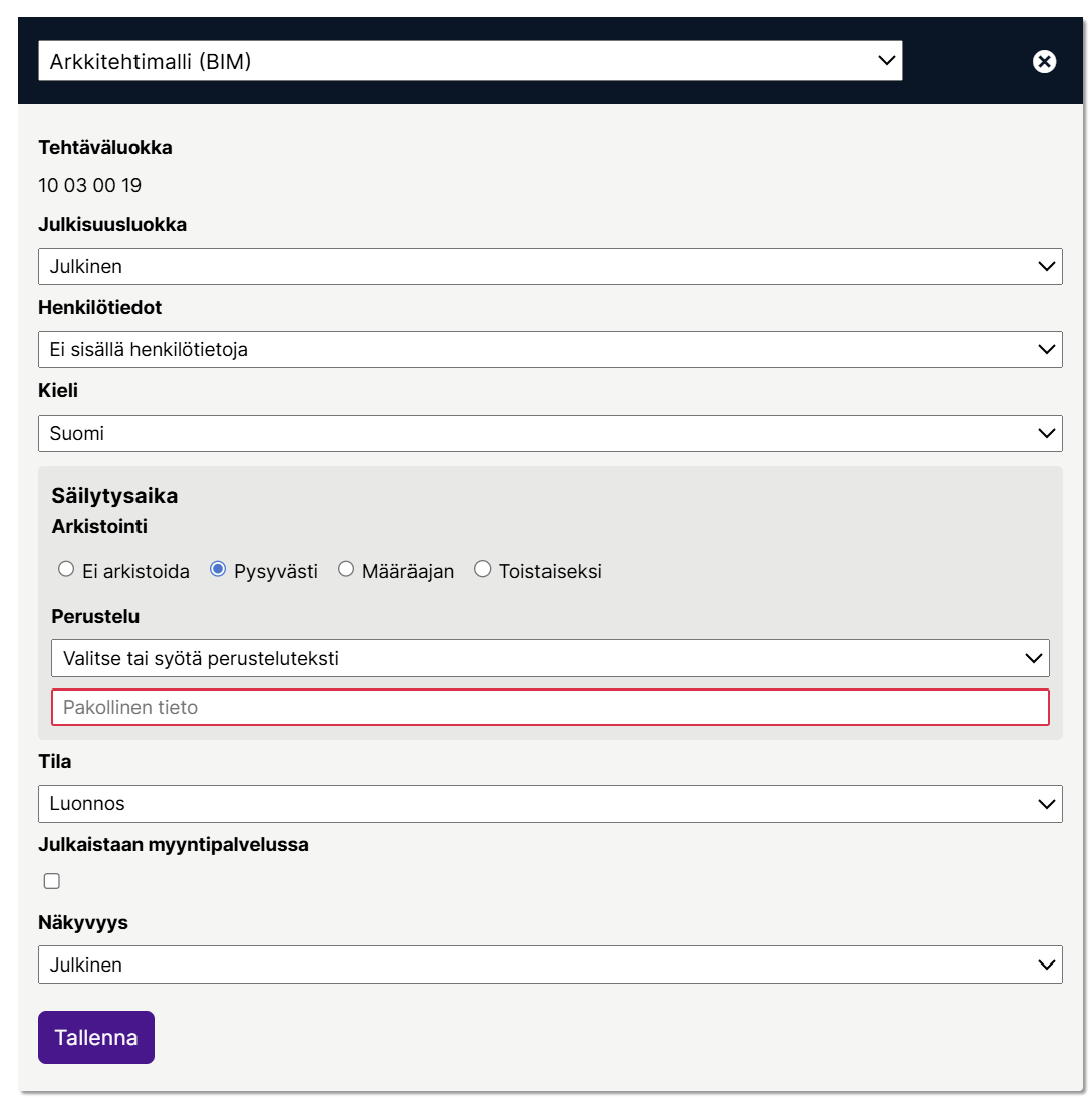 Kuten aiemminkin asiakirjojen ja niiden liitteiden kohdalla, myös tietomallit sekä niiden liitteet määritetään Lupapisteen tiedonohjaussuunnitelman menettelyyn vain kerran, ja samaa metatietoa käytetään kaikkien vastaavan tyyppisten tietomallien ja niiden liitteiden arkistoinnissa. Jos tietomallit liittyvät useaan erilliseen menettelyyn, tulee ne määrittää kuhunkin menettelyyn erikseen.