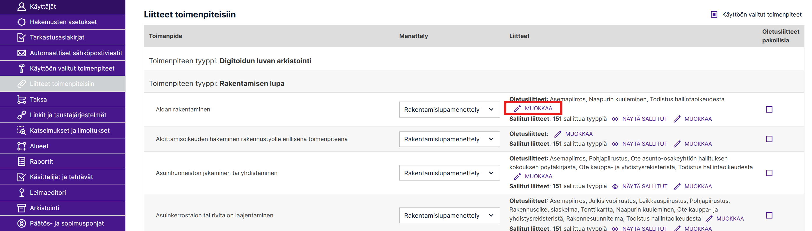 Oletusliitteet valitaan Pääkäyttäjäasetuksissa ”Liitteet toimenpiteisiin”-osiossa. Painamalla ”Muokkaa”-painiketta pääset valitsemaan liitteet.