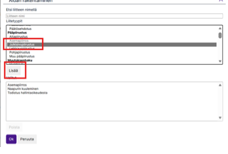 Valitse ”Liitetyypit”-listalta haluamasi liite ja paina ”Lisää”-painiketta lisätäksesi liitteen valituksi.