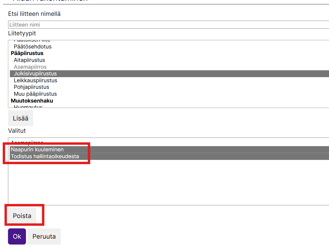 Jos taas haluat poistaa liitteitä, valitse yksi tai useampia ”Valitut”-listalta, ja paina ”Poista”-painiketta. (Useita liitteitä voi valita painamalla Ctrl-näppäimen pohjaan ja valitsemalla hiirellä klikkaamalla kaikki halutut liitteet.)